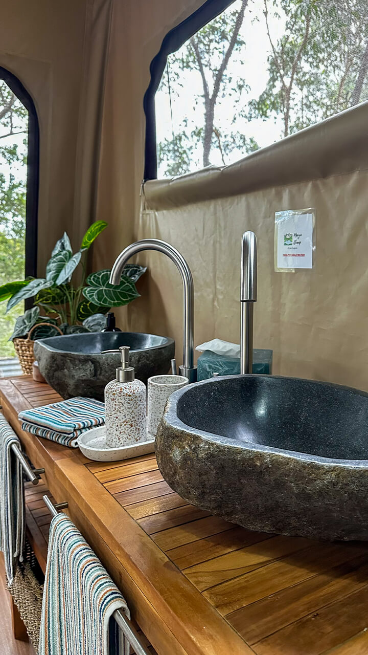 The ensuite offers 5-star facilities with teak vanity with double riverstone sinks. With a rain head shower and botanical toiletries for your use.