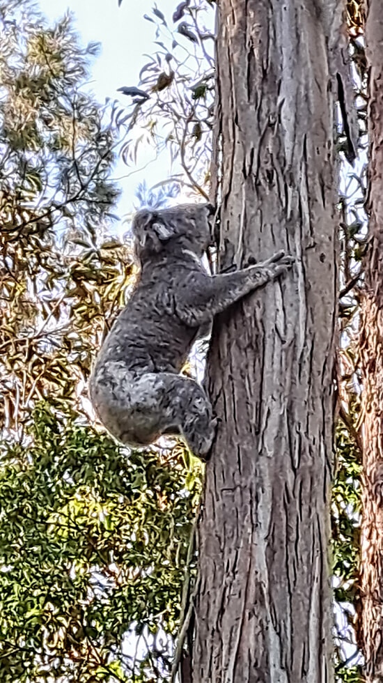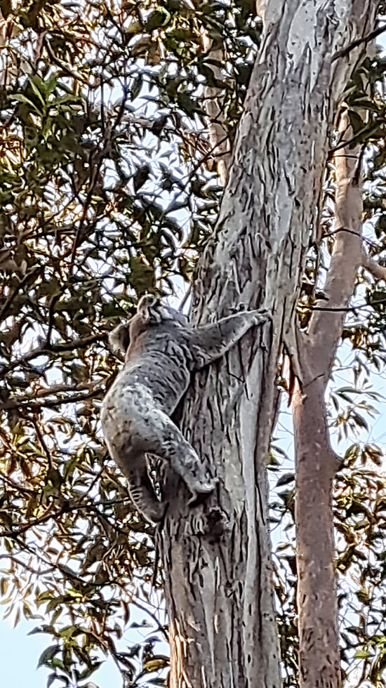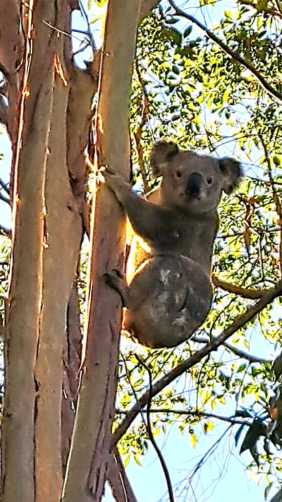 At Moogie Pod, you may be lucky to see the brownish coated female koala in the trees to the left of the Pod. At Moogie House, the smaller young male koala (with wonderfully large tuffed ears) often is high in the trees seen from the track. Our guests at Moogie Glamp often hear our very healthy larger male named Harley around the tent, before they see him, although the trees around the Glamp are his favourite place to hang out.
